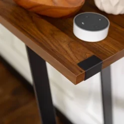Design your entryway with this entry table from Saracina Home. This entry table has angled metal legs with metal wrapping on the edges of the table for added style. Featuring a high-grade MDF, laminate table top in a wood grain for a rustic finish. Having an urban industrial style to flatter your home, this entry table is perfect for decorative purposes with flowers and vases on the table top and a wall mirror above for a welcoming appearance. Can also be used as a sofa table alongside the back of your sofa in your living room to display family photos or in your office as a desk.